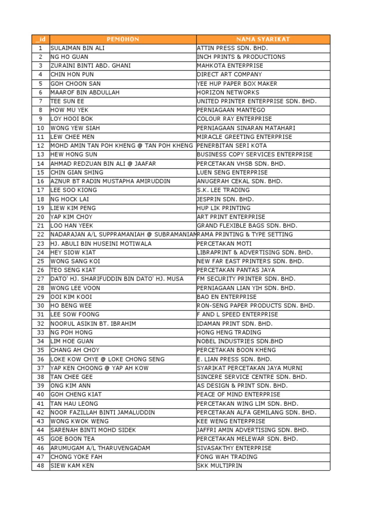 Senarai Pemegang Lesen Mesin Cetak Sehingga Mac 2017 Malaysia