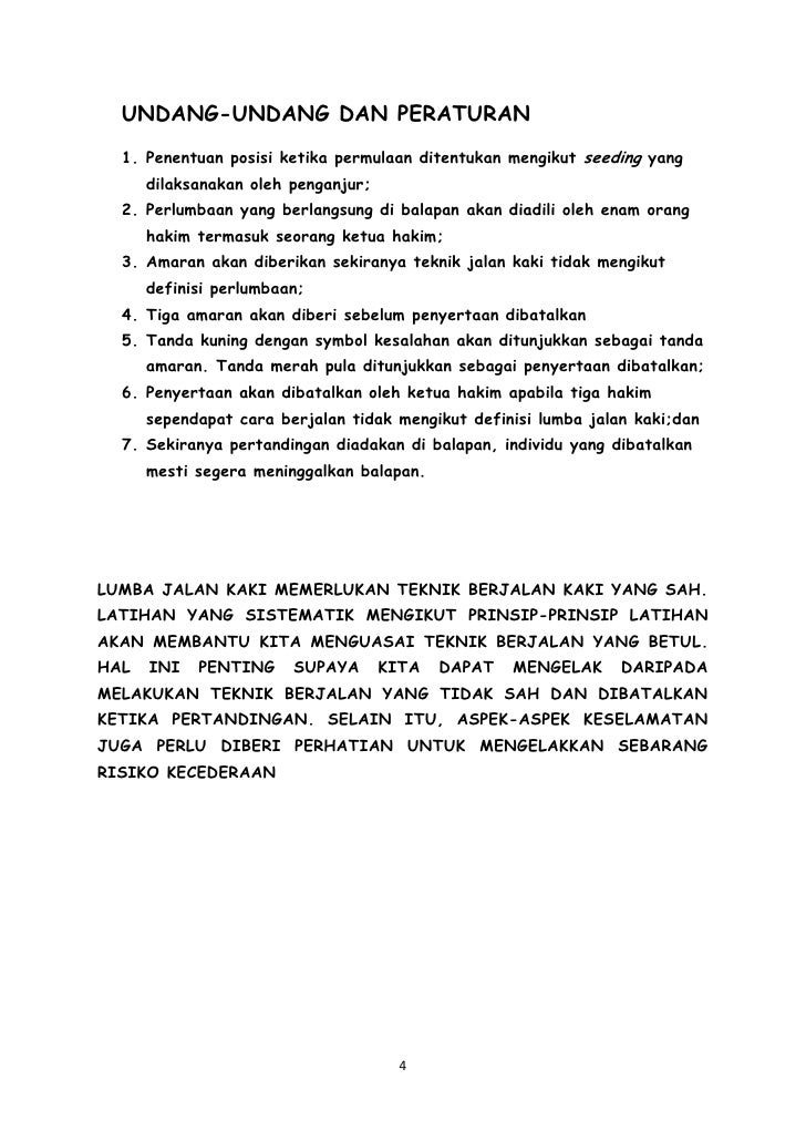 842010 Pada 1906 acara lumba jalan kaki yang berdiri secara sendiri iaitu lumba jalankaki jarak 1500m and 3000m telah diperkenalkan semasa sukan Olimpik dan kecualipada 1924 terdapat sekurang-kurangnya satu acara untuk lelaki bagi setiappertandingan lumba jalan kaki. Pertandingan lumba jalan kaki. 1 3Badan condong ke belakang Jarak langkah terlalu panjang Badan condong ke hadapan 2 4Lutut bengkok 90 4.